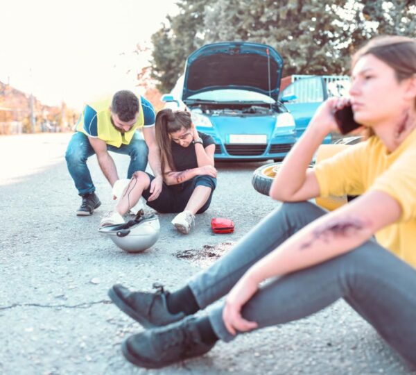 Nearby, a young woman sat on the ground beside a silver sedan. Her posture and expression suggested exhaustion and distress, and she appeared unable to fully respond to the situation around her.