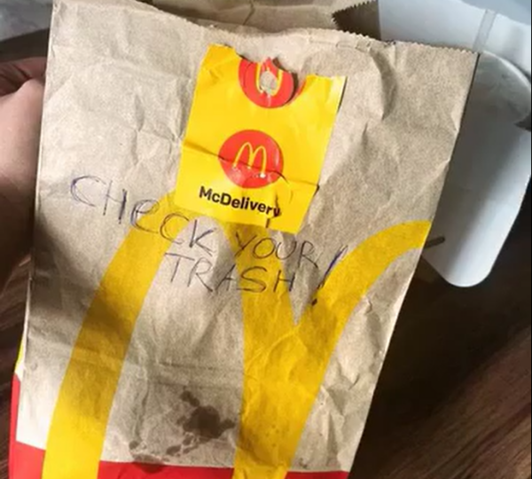 As I opened the bag to retrieve the food, I noticed a folded note tucked inside. Written in hurried, deliberate handwriting, it read: “CHECK YOUR TRASH CAN.” A chill ran down my spine, and my pulse quickened immediately.
