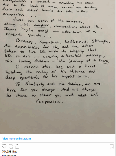 At the top of the letter, she simply wrote: “James.” Holmes’ caption accompanying the image read: “I formed some words with a heavy heart. This is a lot to process. I am so grateful to have shared in a piece of James’ journey.”