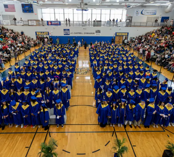 Blue and gold streamers hung from the rafters, and rows of graduation caps rested neatly on the heads of students trying their best to look composed.