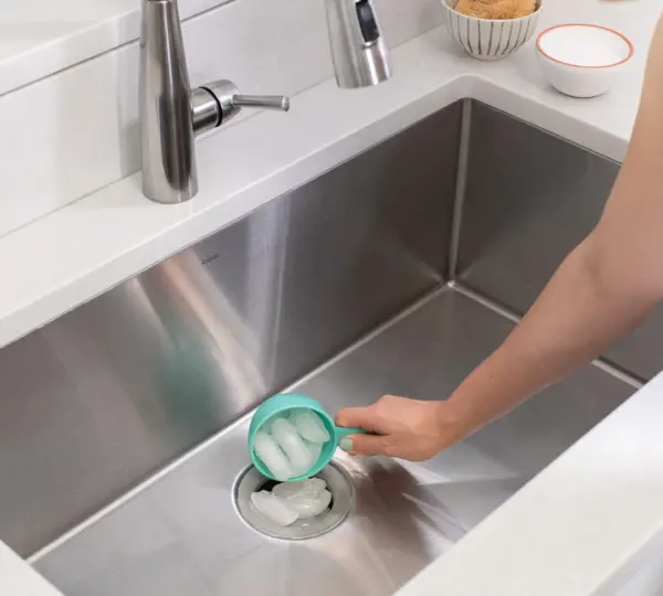 Ice cubes also have multiple benefits. Hard ice helps scrape residue off the blades of a garbage disposal. The mechanical action of ice prevents buildup, keeping the disposal working efficiently and reducing the risk of jams or clogs.