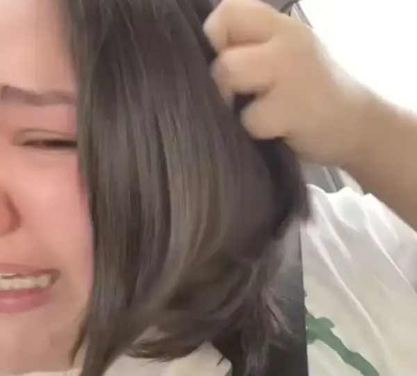 The young woman sat frozen, her eyes wide, tears continuing to streak her cheeks as she took in the scene. Hair fell around her and theirs alike, collecting on the floor in a growing testament to shared vulnerability.