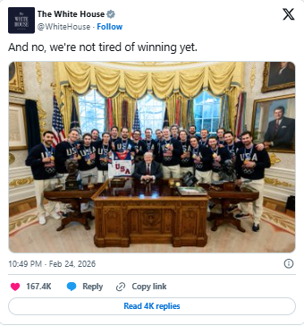 On February 24, during the State of the Union, the U.S. men’s hockey team proceeded with the White House visit. President Trump acknowledged the players during the address, recognizing them as national champions.