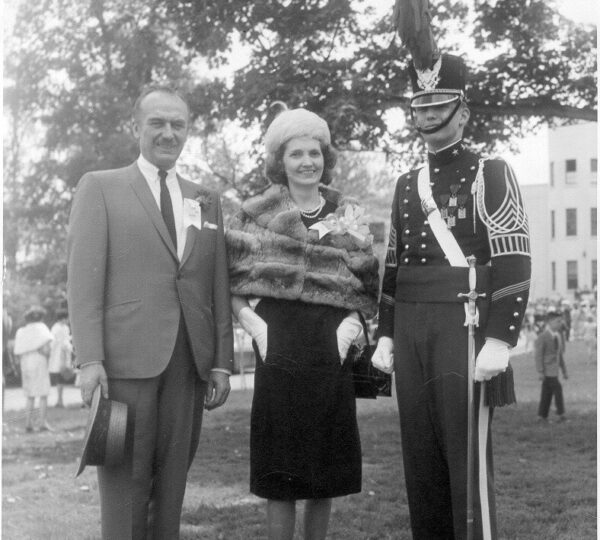 The image shows Trump dressed in uniform alongside his parents, Fred Trump and Mary Anne MacLeod Trump, during his time at New York Military Academy.